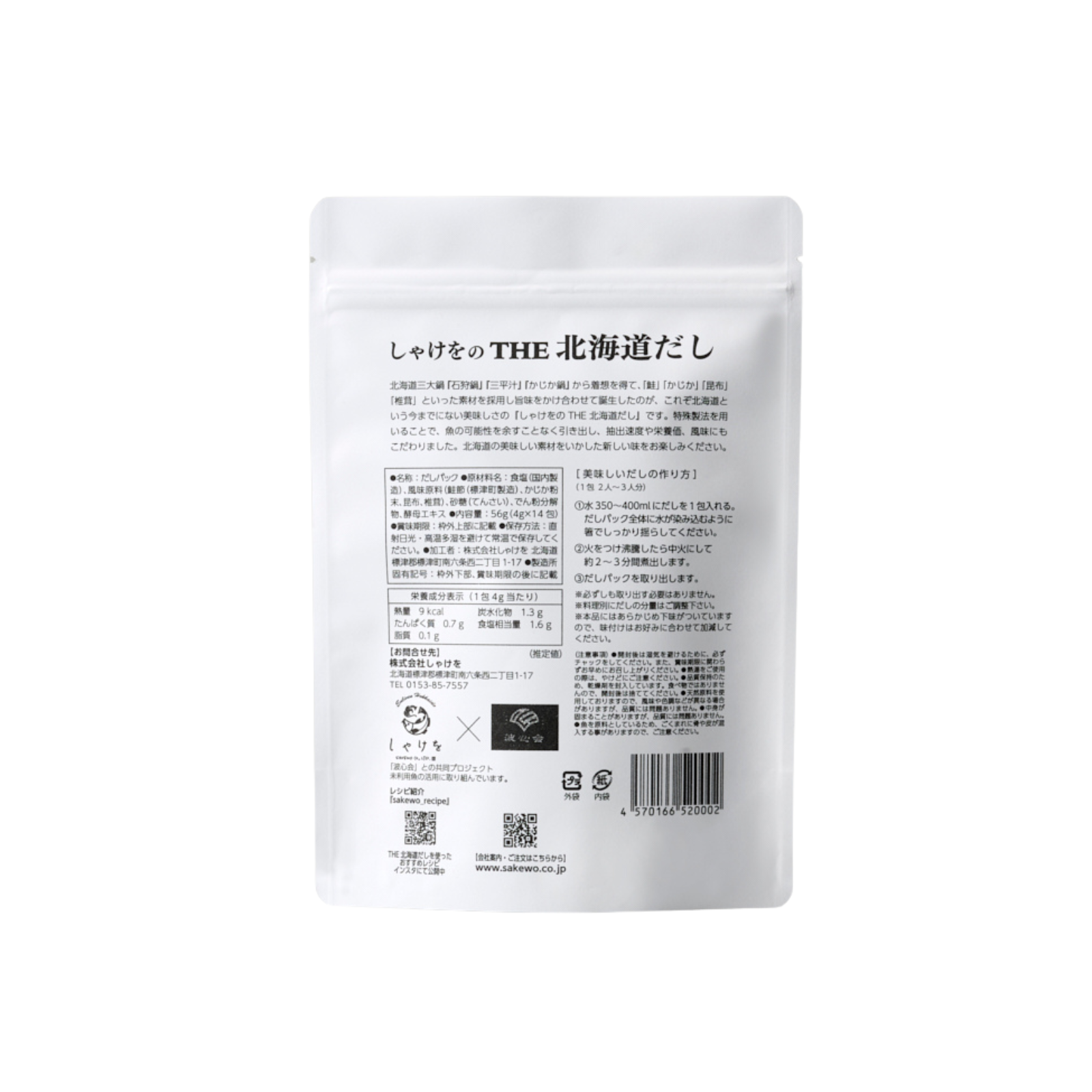 『標津の鮭節』×『北海道産かじか』×『北海道産昆布』×『国産椎茸』をブレンドした、他には無いこれぞ北海道のだし『THE北海道だし』を開発しました!魚のイノシン酸、昆布のグルタミン酸、椎茸のグアニル酸、旨味成分の掛け合わせが味の相乗効果をもたらせ、だしの美味しさを引き出します。